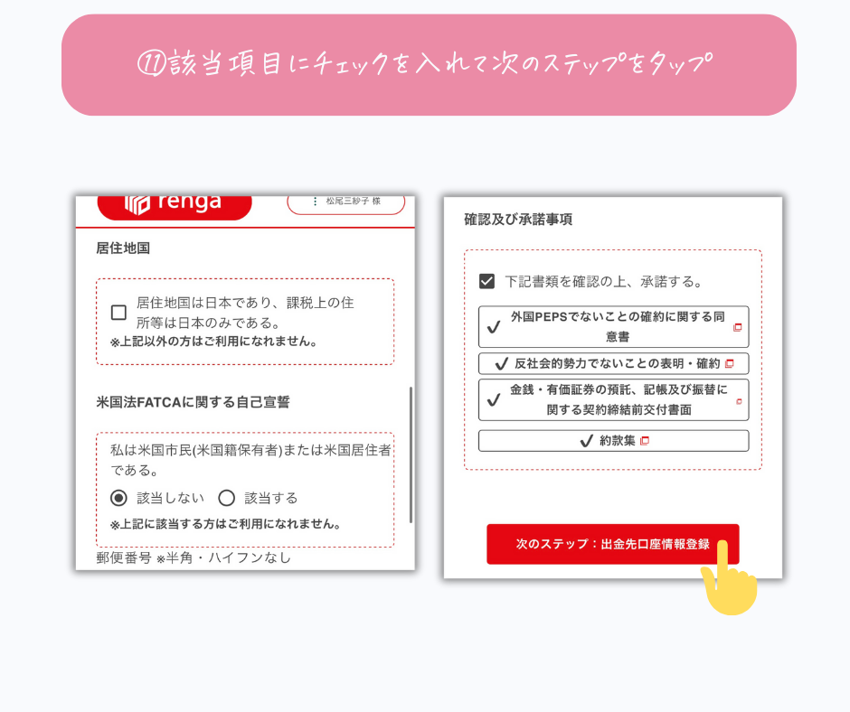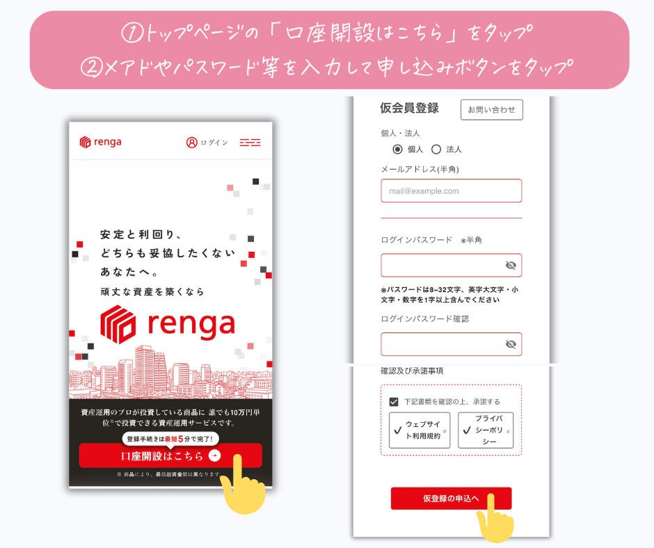 rengaの口座開設はオンラインで手続きが完結し、最短5分程度で申し込みが完了します。申し込み後、1〜3営業日程度で開設が完了します◎